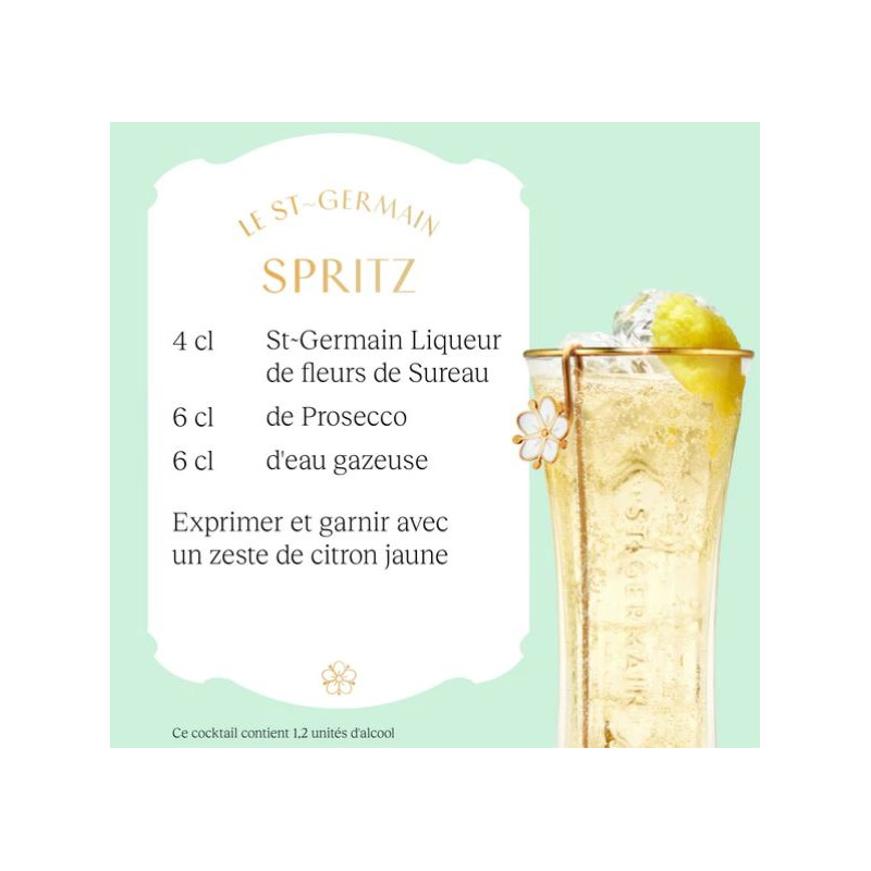 Préparée en France avec jusqu’à 1 000 fleurs de sureau fraîches par bouteille, chacune numérotée pour souligner son caractère artisanal. Inspirée de l'art déco et de l'effervescence artistique des années 20 à Saint-Germain-des-Prés, cette liqueur élève tous les cocktails, du St-Germain Spritz au St-Germain Royal, grâce à sa touche dorée et son équilibre parfait. Un incontournable pour les barmans et mixologues.